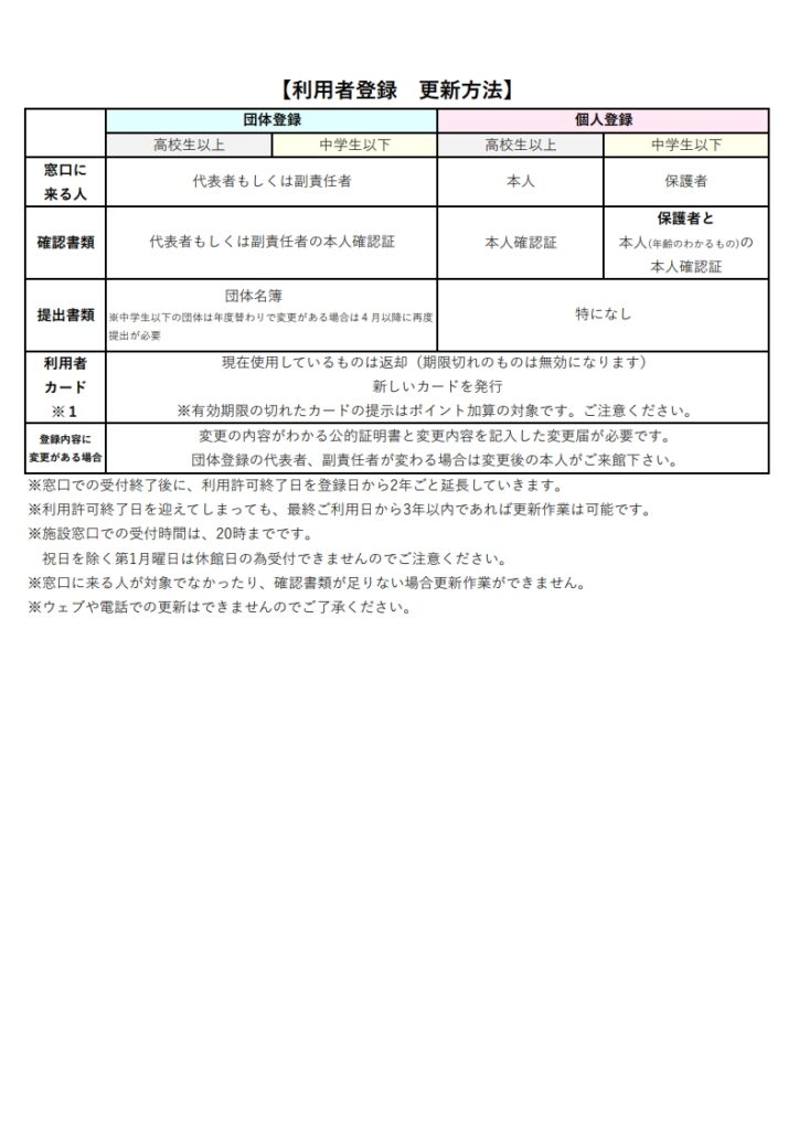 【重要】利用者登録 更新のお知らせ 新着情報 2026.01.10 2024年4月から予約システムが変わりました。 利用者登録の日からから2年で、利用許可終了日が参ります。そのため、終了の3か月前の1日から各施設窓口で更新作業を受け付けております。 更新作業をせずに、例えば3月31日で利用許可終了日を迎えると4月1日分からの予約が取れなくなります。そのため市内登録の抽選予約対象の方も、抽選予約に入れなくなりますのでご注意ください。 更新に必要な情報は以下の表をご確認ください。